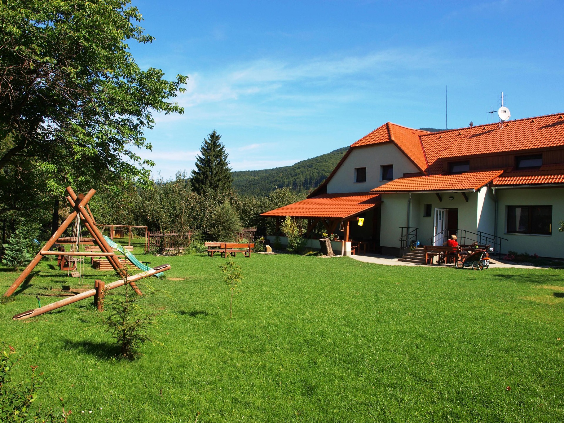 Třílůžkový pokoj je vybaven televizí a úložnými prostory. Koupelnu se sprchovým koutem a WC sdílí s dalším pokojem. K vaření je možné využít mikrovlnou troubu či kuchyni ve společných prostorách pensionu. K dispozici zdarma je parkování, úschovna lyží či kol, připojení na wi-fi i zahrada s dětským hřištěm a posezením.