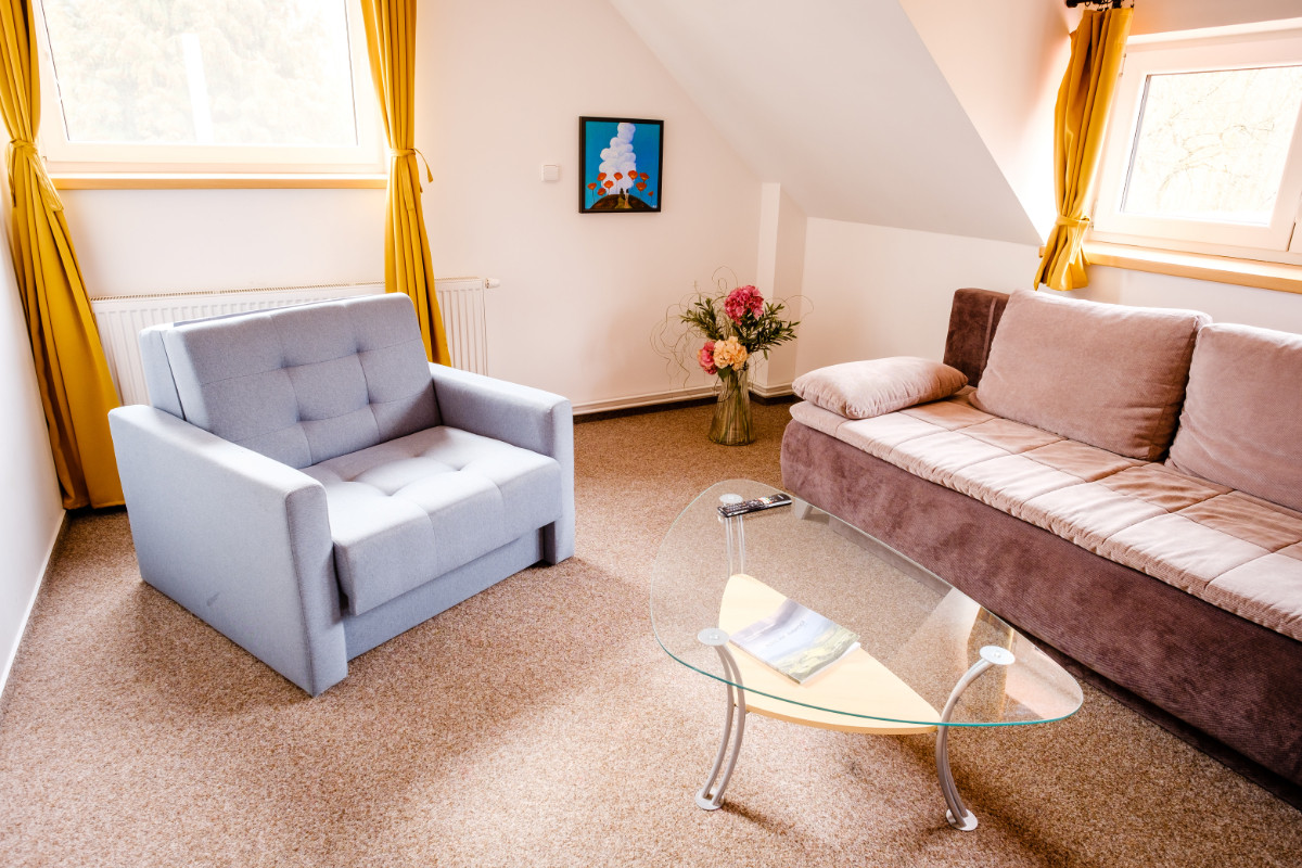 Prostorný apartmán formátu 1+kk je vybaven vlastní koupelnou se sprchovým koutem a WC, televizí a kuchyňskou linkou s lednicí, mikrovlnnou troubou a vařičem. V obytné části se nachází kuchyňský a jídelní kout, rozkládací sedací souprava a televize. V oddělené ložnici jsou tři jednolůžkové postele a úložné prostory. K dispozici zdarma je parkování, úschovna lyží či kol, připojení na wi-fi i zahrada s dětským hřištěm a posezením.